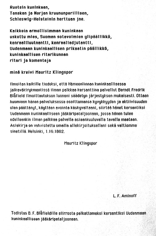 Adlercreutzin rykmentin ensimmäinen adjutantti 4.6.1804. Armeijan
