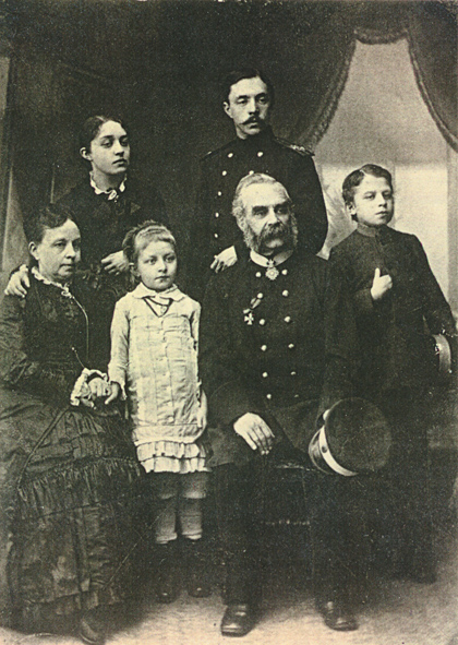 Eversti Carl Ivar Blåfild perheineen. Kaulassa Pyhän Stanislauksen II -luokan kunniamerkki keisarillisella kruunulla.