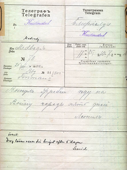 TELEGRAM Sotaanlähtömääräys 5 päivän kuluttua eversti Leonid Blåfieldille 25/VIII 1904 (Venäjän-Japanin sotaan)