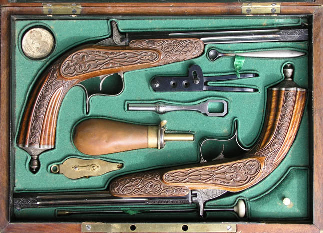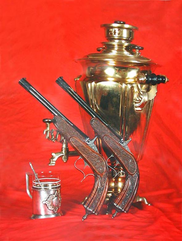 Piipuissa tekstit kyrillisin kirjaimin: "Tulan asesepät" ja taaempana Ramsay-suvun vaakunat. Toinen pistooli on suustaladattava toinen takaaladattava piikkipanospistooli.