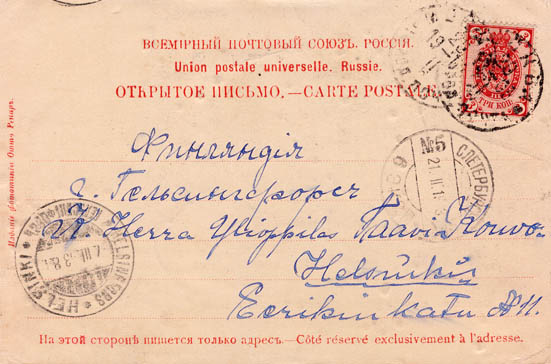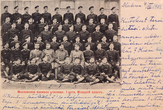 Suomalaisen sotilaan lähettämä postikortti Moskovasta Suomeen vuonna 1903. Sotilas itse mukana kuvassa.